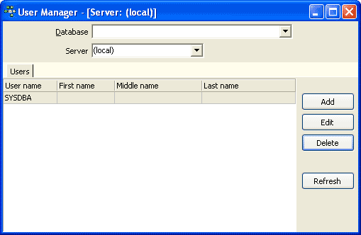 В поле Login уже будет задано имя пользователя SYSDBA. Вам нужно в поле Password ввести пароль masterkey (или другой, если вы изменили значение пароля) и нажать на кнопку ОК. Появится список учетных записей, который будет содержать только одного пользователя SYSDBA.