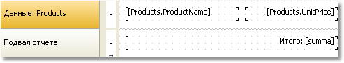 Список итогов можно увидеть в окне Данные. Из него можно перетаскивать итоги в скрипт, при этом FastReport автоматически создает код для обращения к итогу.