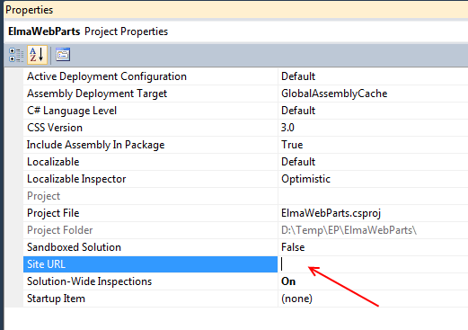 2.3. В свойствах проекта вводим URL до сервера SharePoint 2010.