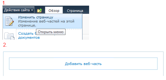 3. Переведите страницу MS SharePoint в режим редактирования. Для этого выберите в меню в левом верхнем углу страницы пункт Действия сайта => Изменить страницу и в зоне, в которую требуется добавить портлет ELMA, нажмите кнопку Добавить веб-часть.