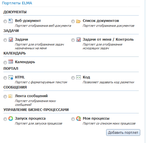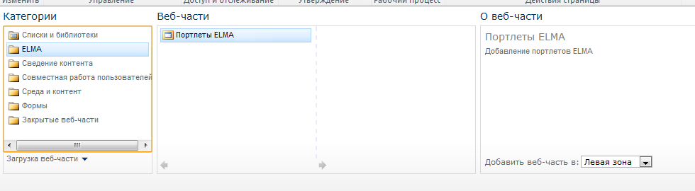 4. На панели, появившейся в верхней части экрана, в списке Категории выберите пункт ELMA. В списке Веб-части – Портлеты ELMA. На странице появится новый портлет.