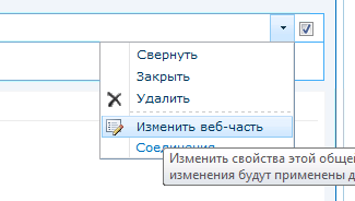 5. В контекстном меню портлета выберите пункт Изменить Веб-часть. В правой части страницы появится панель настройки портлета.