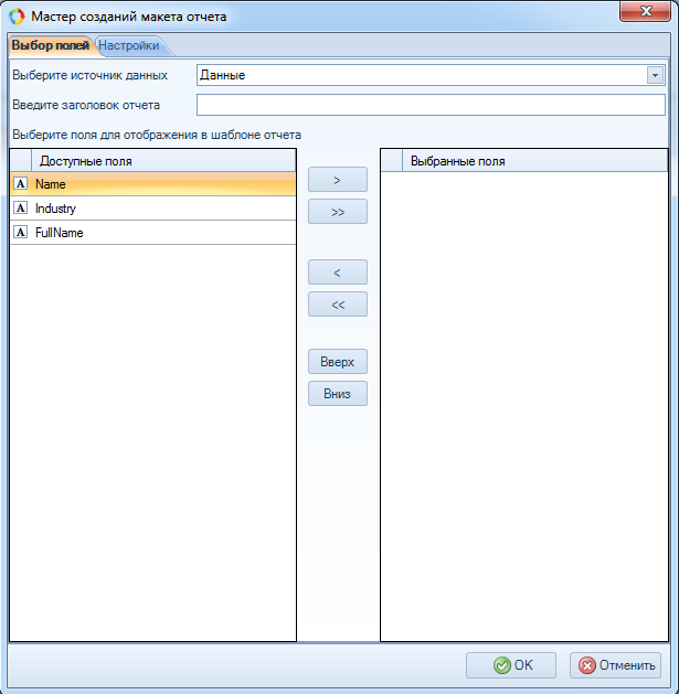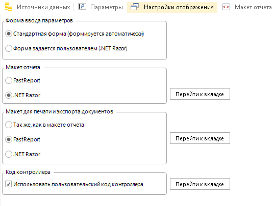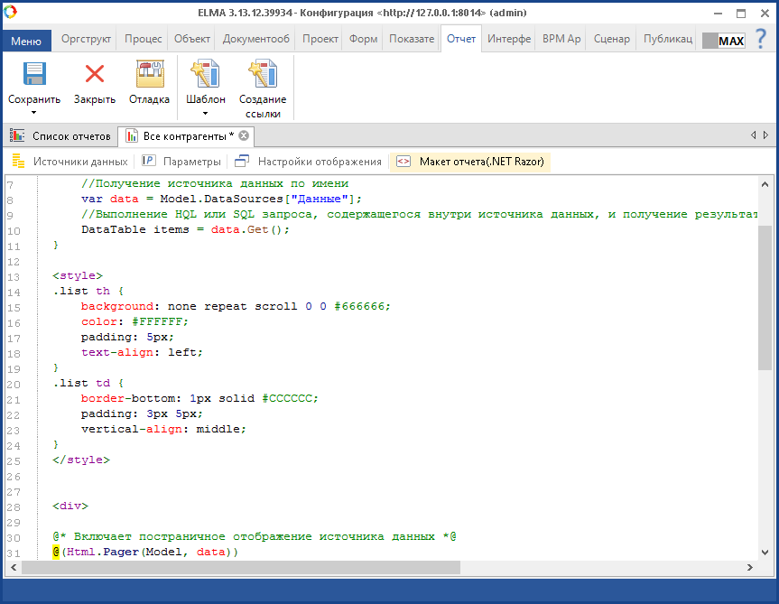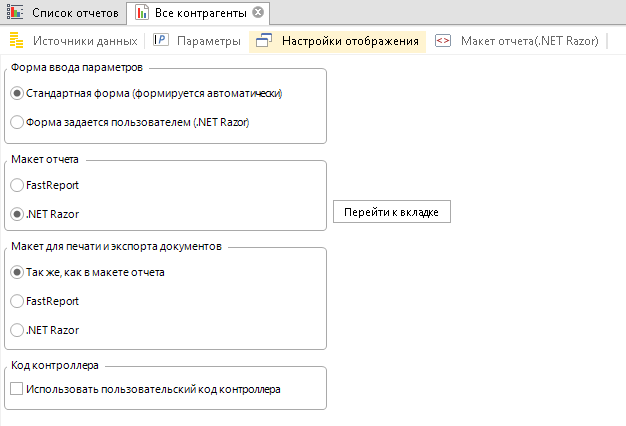В дизайнере в разделе Отчеты создаем отчет по контрагентам – Все контрагенты, который будет выводить информацию о контрагентах, отрасль и ответственных за контрагентов. Настроим отображение отчета на .NetRazor, на вкладке Настройка отображения: