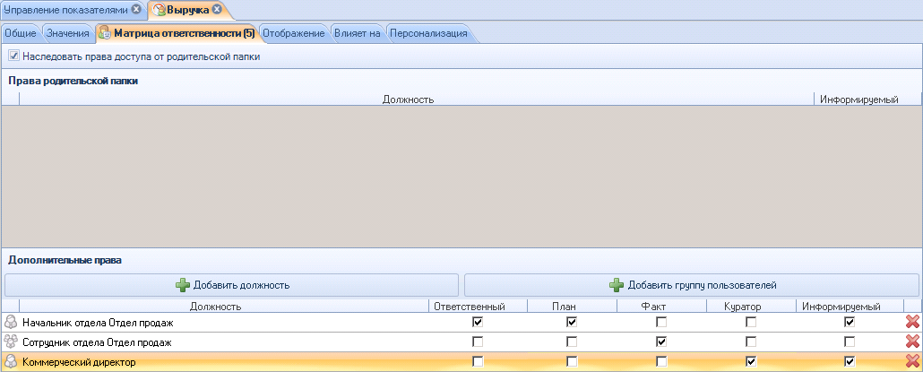 Затем на вкладке Матрица ответственности определим ответственных, в нашем случае это сотрудники отдела продаж и Начальник отдела продаж. Начальник отдела продаж является Ответственным за показатель, выставляет план продаж. Коммерческий директор является Куратором, и имеет полные права на изменения как плановых, так и фактических значений показателя.