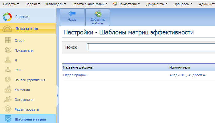 Создать матрицу эффективности можно прямо в веб-интерфейсе, в разделе Шаблоны матриц, нажав на кнопку Добавить шаблон. Подробнее о матрицах эффективности можно прочесть здесь.