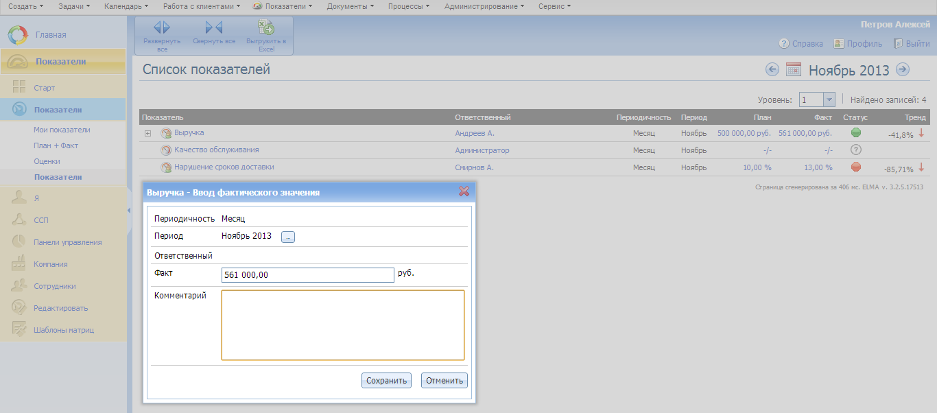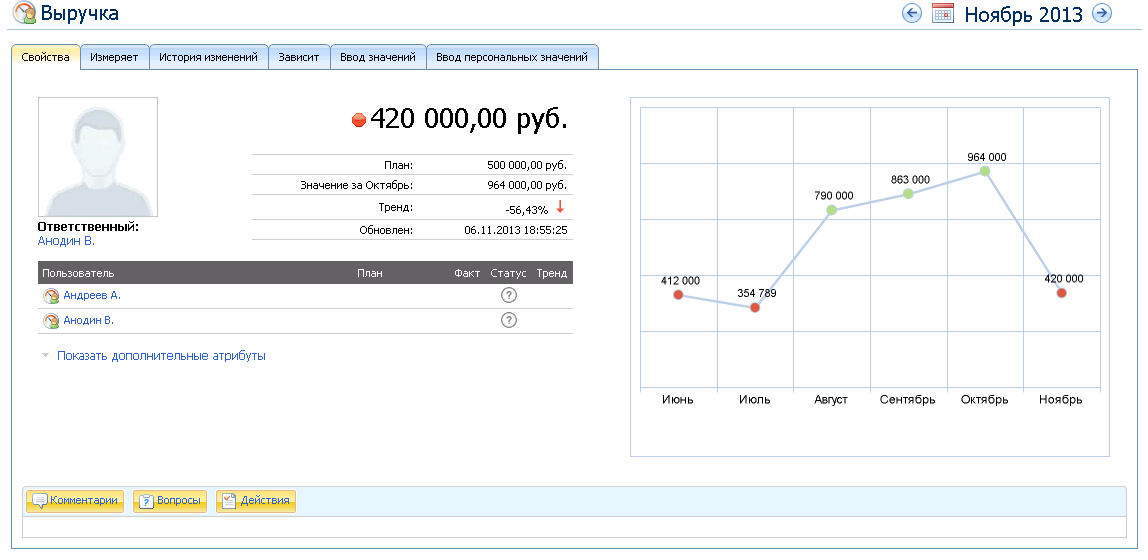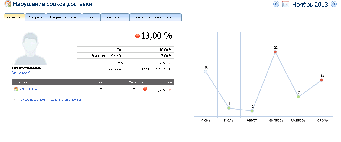 А так может выглядеть окно сотрудника, ответственного за доставку. В данном случае, чем ниже значение показателя, тем лучше, поэтому при плановом значении 10%, а фактическом 13% статус показателя красный, а тренд -85% по сравнению с прошлым месяцем. Убывание, возрастание, стабилизация показателя – все это настраивается при создании показателя на вкладке Значения.