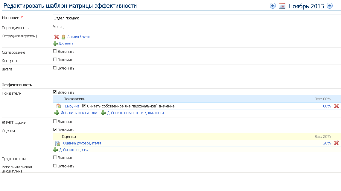 В данном примере выручка имеет вес 80%, а остальные 20% - оценка руководителя. Иначе говоря, эффективность сотрудника отдела продаж на 80% состоит из суммы выручки принесенных этим сотрудником и на 20% из оценки его работы руководителем. Таким образом, чтобы достичь 100% эффективности, сотруднику необходимо выполнить или перевыполнить план и получить хорошую оценку руководителя. Если оценка за месяц низкая, ее может компенсировать перевыполнение плана. Оценка руководителя не обязательно должна находиться в матрице эффективности, но при необходимости, добавляется и заполняется она прямо из веб-интерфейса (подробней об оценке можно прочитать в справке).