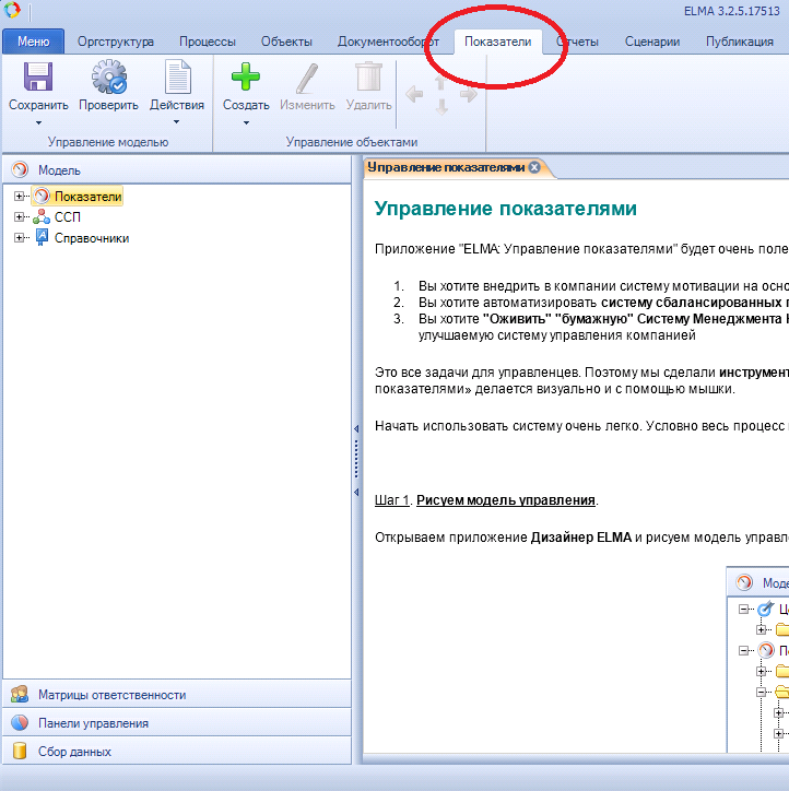 Рис. 1. Дизайнер ELMA. Вкладка "Показатели"