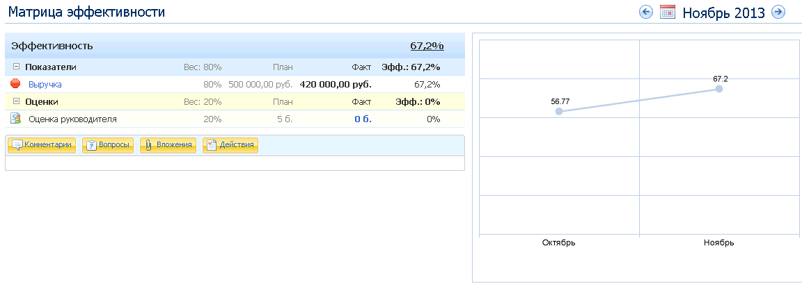 В ноябре план по выручке еще не достигнут, оценка руководителя еще не высталена – эффективность сотрудника всего 67.2%, однако это выше, чем результат прошлого месяца.