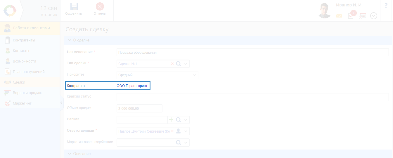 Для удобства пользователей реализована возможность создания сделки прямо из карточки контрагента. Для этого необходимо нажать кнопку Действия – Создать сделку. При этом поле Контрагент будет заполнено автоматически: