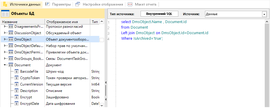 Рассмотрим пример отчета, выводящего все документы, находящиеся в архиве. SQL запрос на выборку данных для отчета представлен на рис. 4.