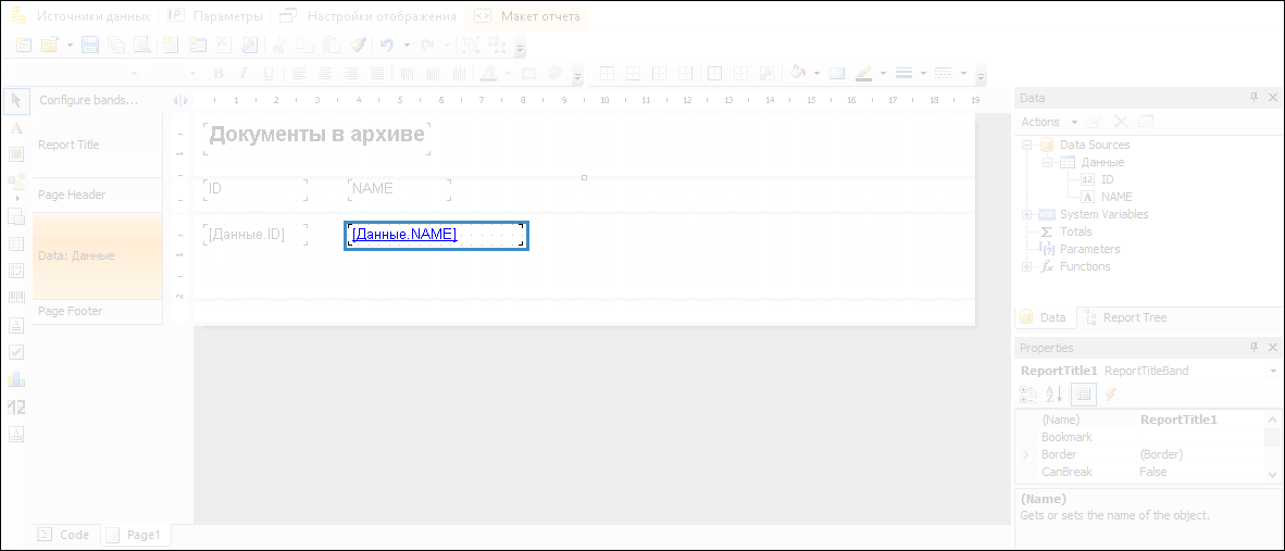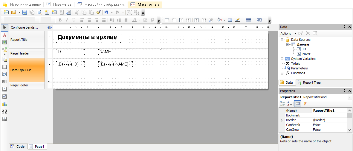 Перейдем на вкладку Макет отчета и вынесем столбцы Id и Name на форму FastReport (рис. 5).