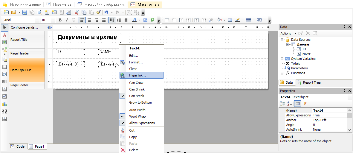 Для размещения гиперссылки на объект, выберем поле Name в области данных отчета (поле в середине), щелкнем правой кнопкой мыши и выберем Hyperlink (рис. 6).