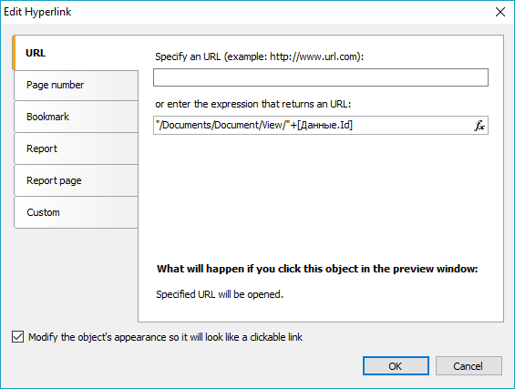Так как ссылки на каждый документ отличаются идентификатором, нам потребуется ввести во второе поле формулу, вычисляющую адрес. Формула состоит из постоянной части в двойных кавычках, знака «плюс» и идентификатора объекта:
