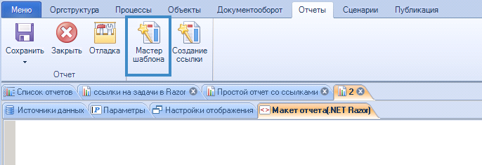 Вкладка Макет отчета изменится на вкладку Макет отчета (.NET Razor), перейдем на нее и увидим пустое поле для ввода Razor разметки.
