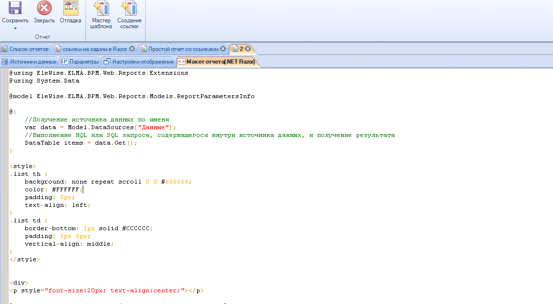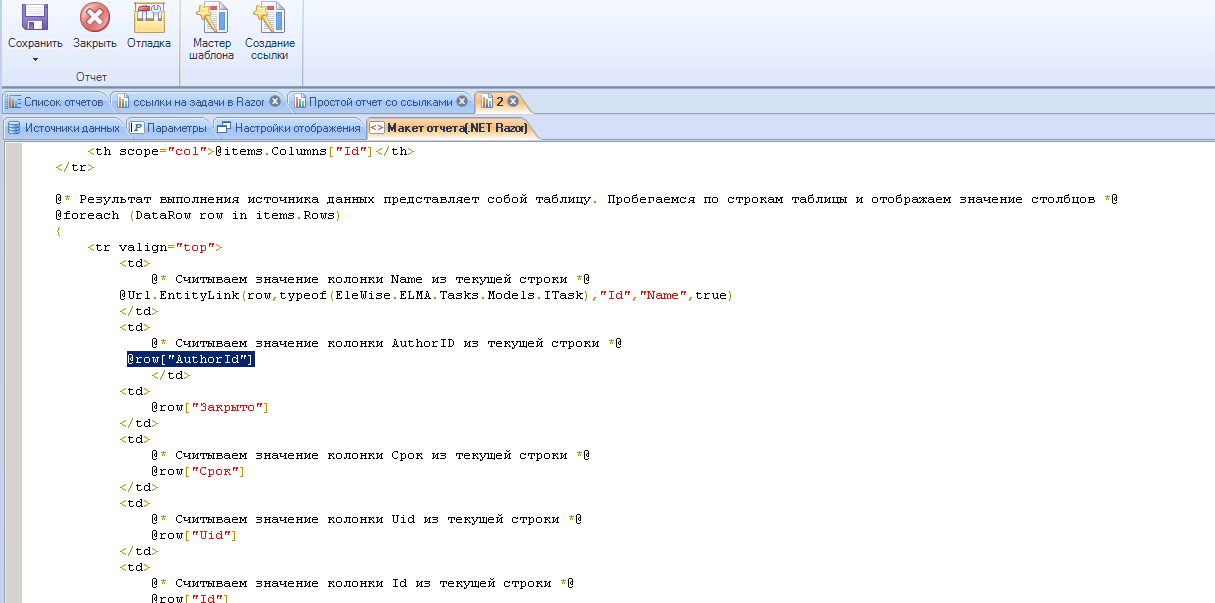 Сложный отчет с ссылками с использованием разметки на языке Razor