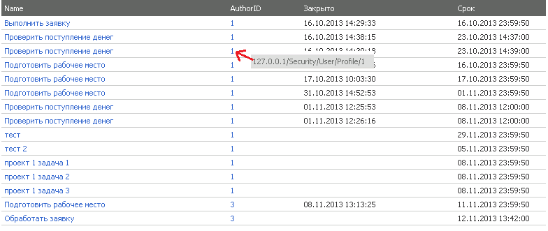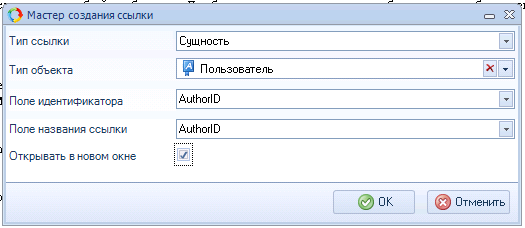 Поле названия ссылки – AuthorId – это поле, которое будет отображаться как название ссылки. В данном случае это Id Автора задачи.