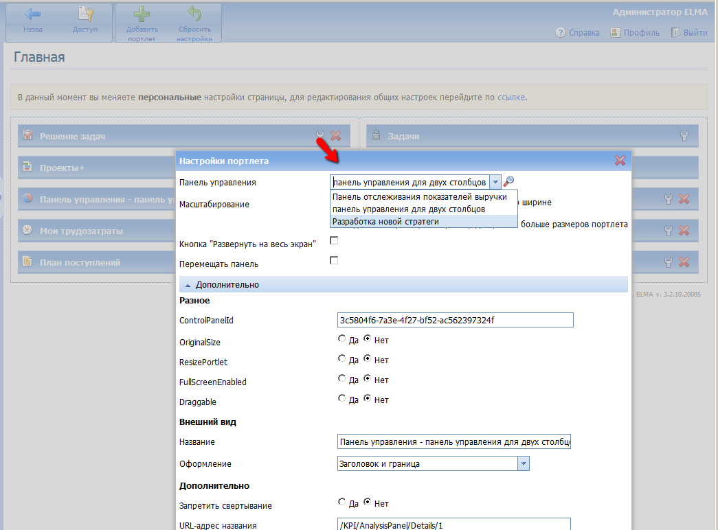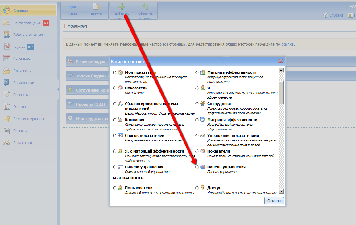 Чтобы увидеть скрытую панель управления в веб-приложении, можно на главной странице добавить портлет Панель управления: