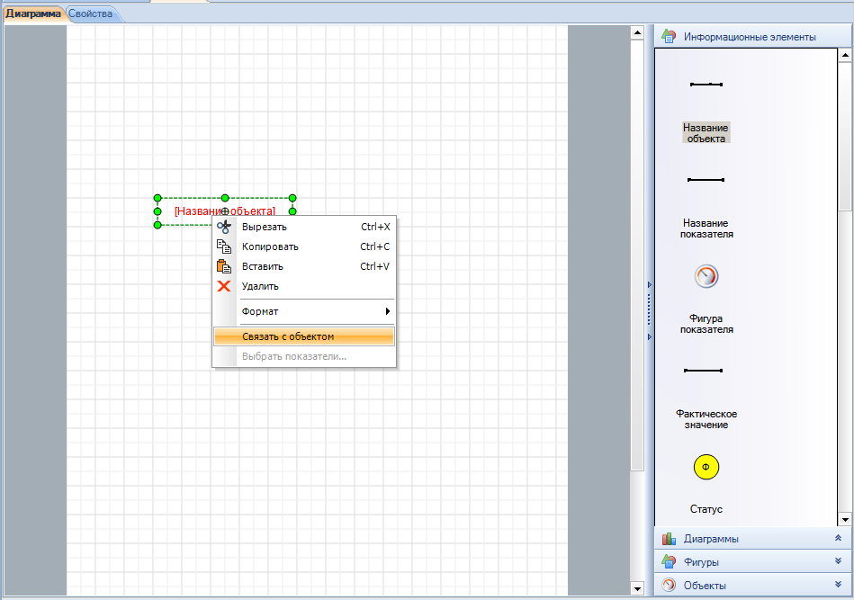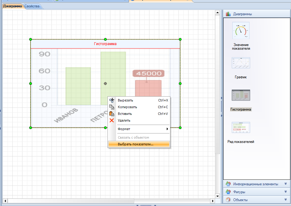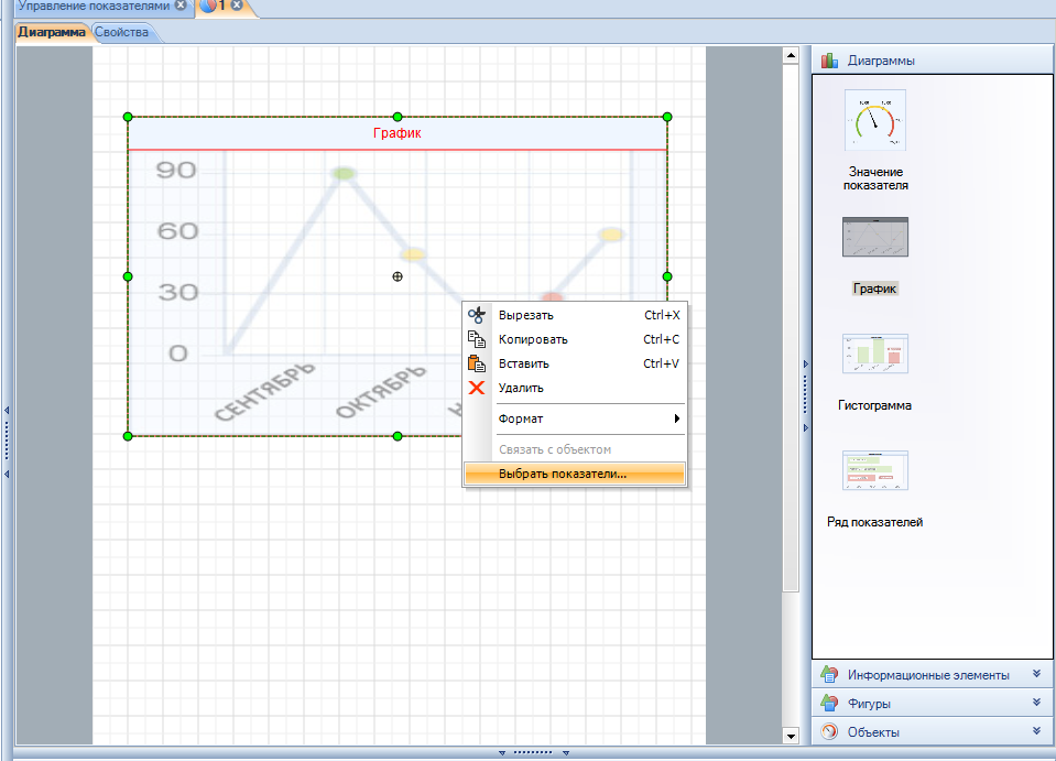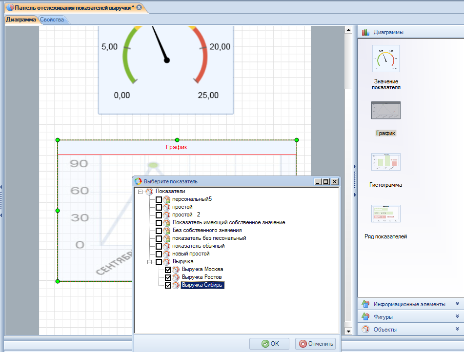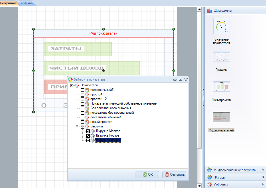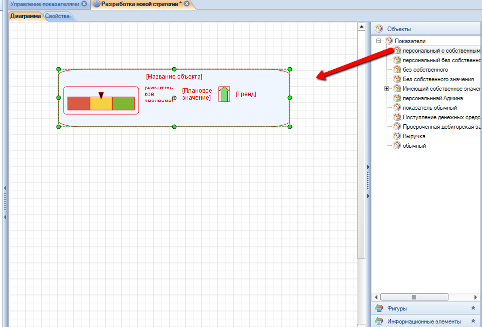 К объектам диаграммы панели управления относятся показатели. Из панели объектов на диаграмму можно перетащить мышью показатели: