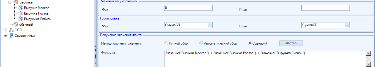 Для удобства рассмотрим пример показателя Выручка (подробнее о показателях можно прочесть в соответствующей статье), состоящего из суммы показателей Выручка Москва, Выручка Ростов, Выручка Сибирь: