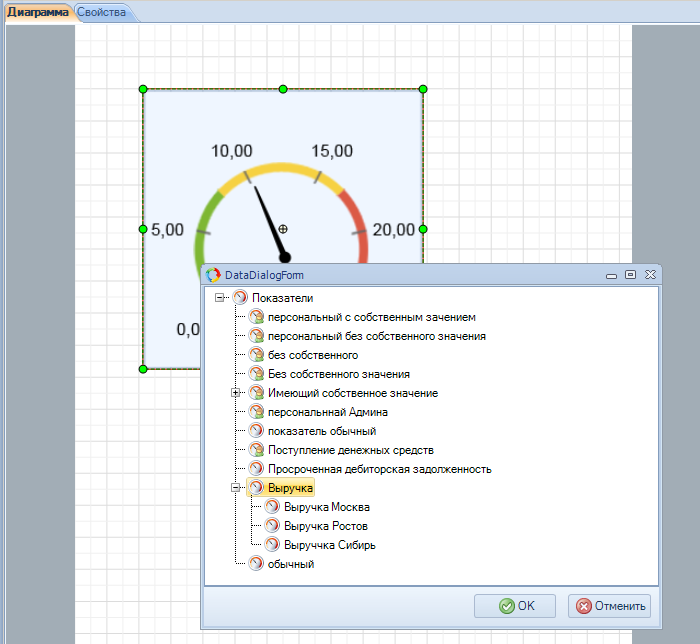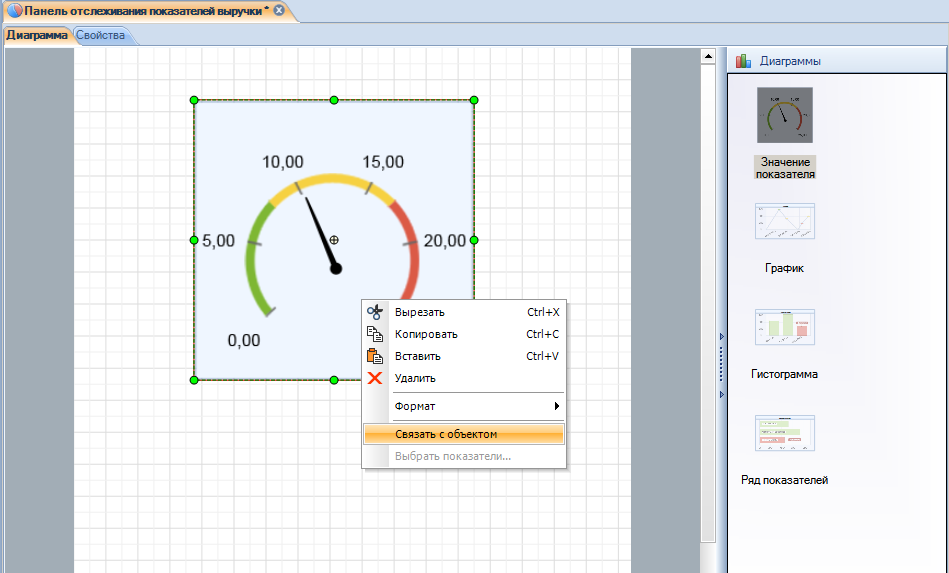 Для создания панели Значение показателя (спидометр) достаточно перенести его мышью на диаграмму и связать с показателем, значения которого нужно вывести на экран: