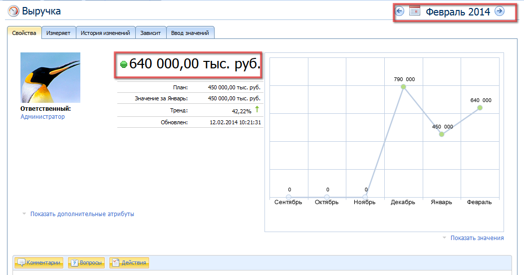 В веб-приложении на карточке показателя Выручка выводятся следующие данные: