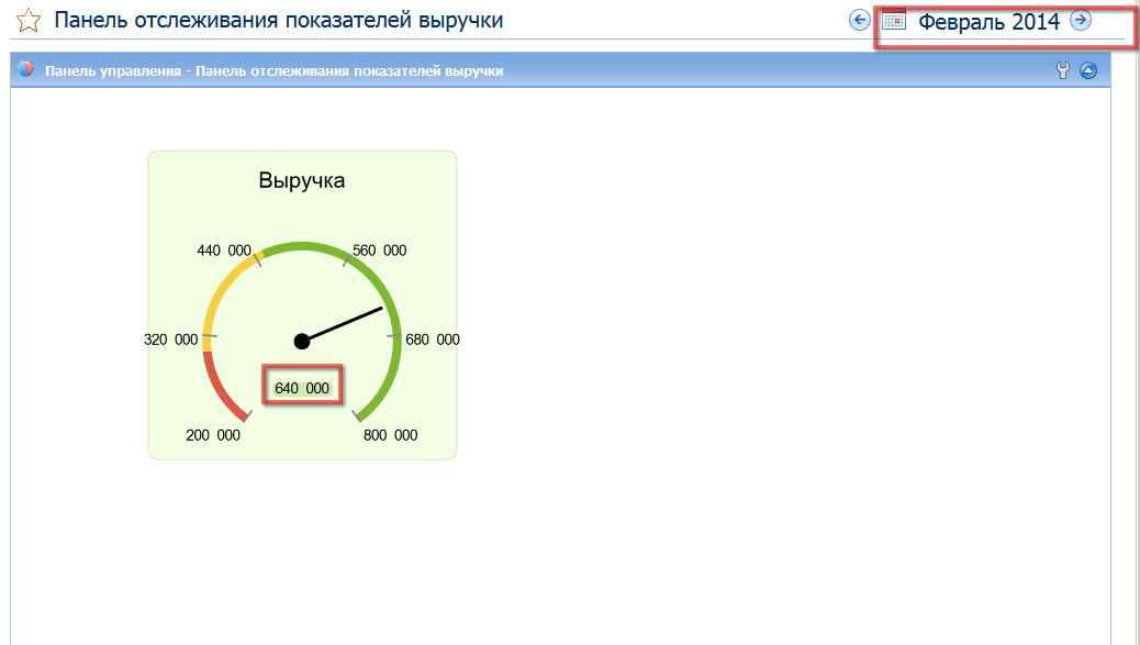 В феврале данные показателя Выручка составили 640 000,00 тыс. руб и попадают в зеленую зону. План состовляет 450 000,00 тыс. руб. На графике спидометра значения от Минимального значения показателя (200 000 т.р.) до Минимального критического (300 000 т.р.) красным цветом (недопустимо низкое значение показателя), от Минимального критического значения (300 000 т.р.) до Плана (450 000 т.р.) желтым (допустимое значение), от Плана (450 000 т.р.) до Максимального значения (800 000 т.р.) зеленым (хорошее значение):