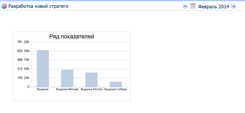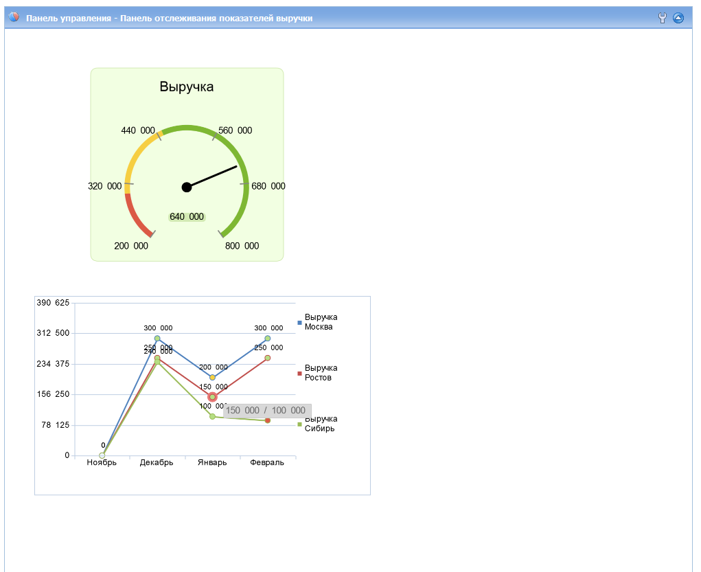 В Панели управления на диаграмме Ряд показателей наглядно показан показатель Выручка и его составляющие Выручка Москва, Выручка Ростов, Выручка Сибирь :