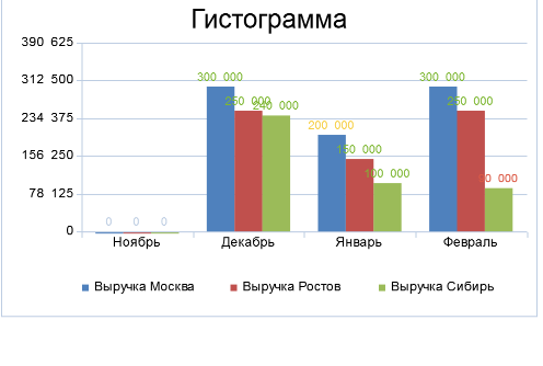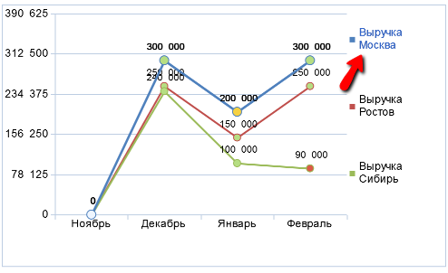 Для того чтобы вывести динамику показателей, составляющих значение показателя Выручка, т.е. показателей: Выручка Ростов, Выручка Сибирь, Выручка Москва, можно воспользоваться следующей диаграммой – График.