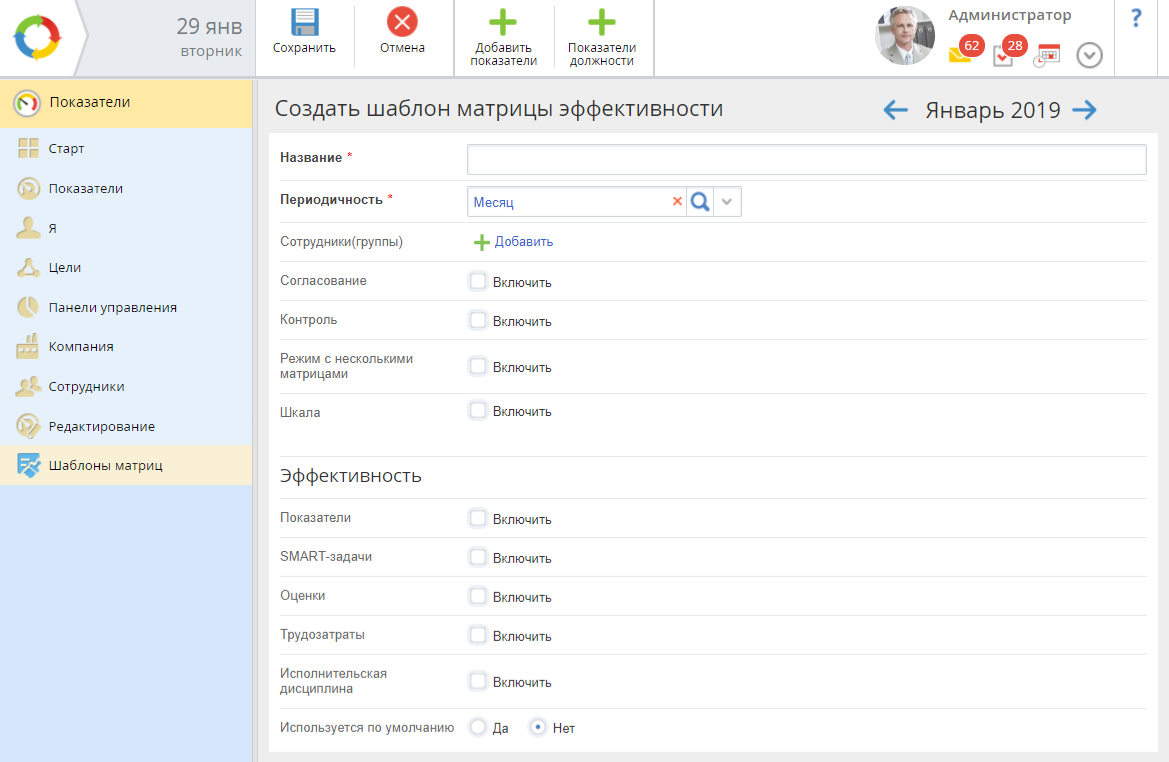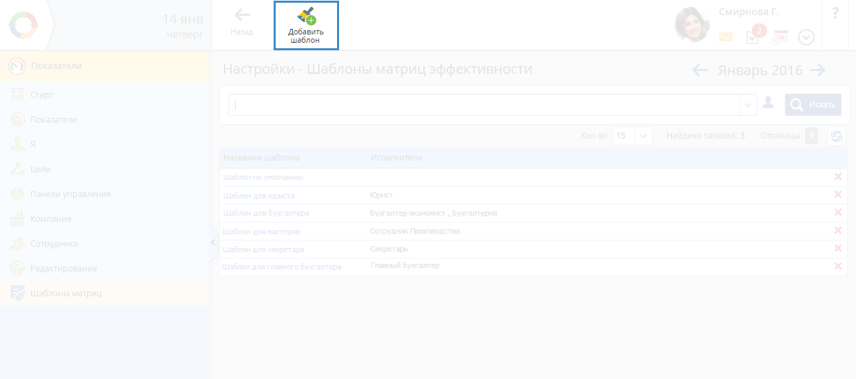 - Добавление шаблона. Для этого нужно зайти в раздел Показатели – Шаблон матрицы эффективности и нажать кнопку Добавить шаблон:
