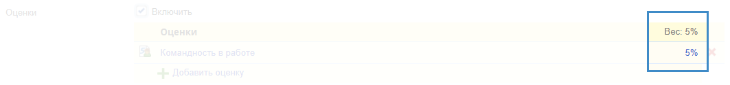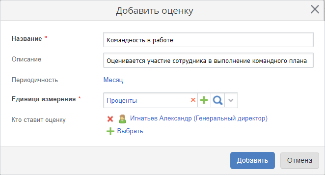 В примере руководитель будет оценивать сотрудника, как он участвовал в выполнении командного плана оценкой Командность в работе: