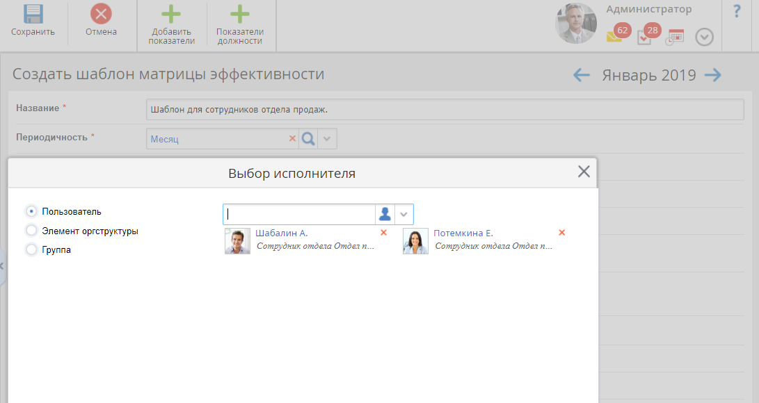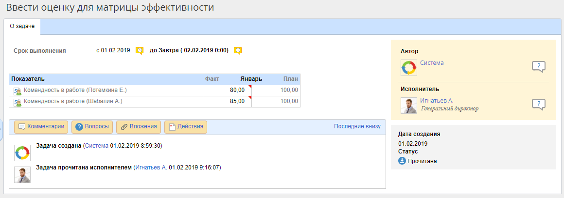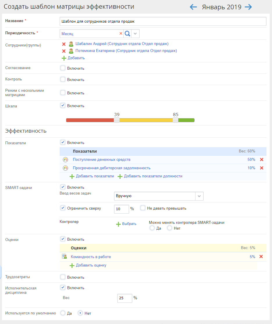 Матрица эффективности создается в Web-части системы ELMA для каждого сотрудника из соответствующего Шаблона.