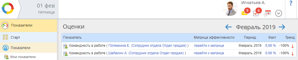 Теперь зайдем в систему ELMA любым сотрудником из отдела продаж и посмотрим Матрицу эффективности этого сотрудника. Матрица эффективности выглядит следующим образом: