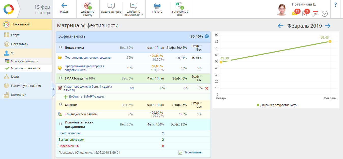 Эффективность составляет 80,46%, обозначена желтым цветом(допустимо) в соответствии со шкалой. Складывается она из показателей "Просроченная дебиторская задолженность" (сотрудница поработала не очень хорошо: по факту сократила только 50%, эффективность составляет 5%) и "Поступление денежных средств" (здесь выполнение по факту – 100%, а по плану – 110%, эффективность составляет 45,46%). SMART-задача еще не выполнена, и её фактическая эффективность на данный момент составляет 0%. Руководитель выставил оценку 100%, то есть сотрудница отлично работает в команде, эффективность – 5%. Исполнительская дисциплина тоже выполнена на все 100%: было поставлено 2 задачи, и они выполнены в срок, эффективность – 25%.