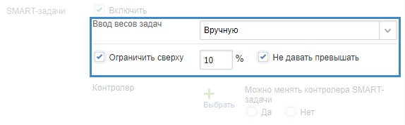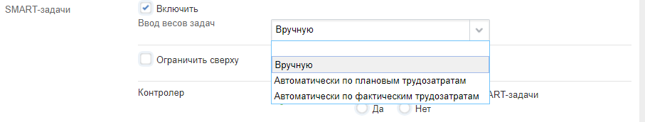 Веса SMART-задач можно вводить несколькими способами: Вручную, Автоматически по плановым трудозатратам, Автоматически по фактическим трудозатратам. В выпадающем списке выберите, каким способом будут вычисляться веса SMART-задач: