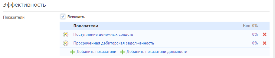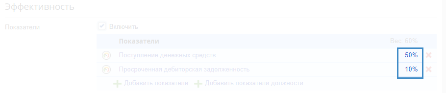Если матрица эффективности состоит из одних только показателей, то сумма весов всех показателей должна быть равна 100%. Если в матрице есть еще какие-то разделы: SMART-задачи и/или Оценки эффективности и/или Исполнительская дисциплина, то сумма весов всех разделов должна быть равна 100%.