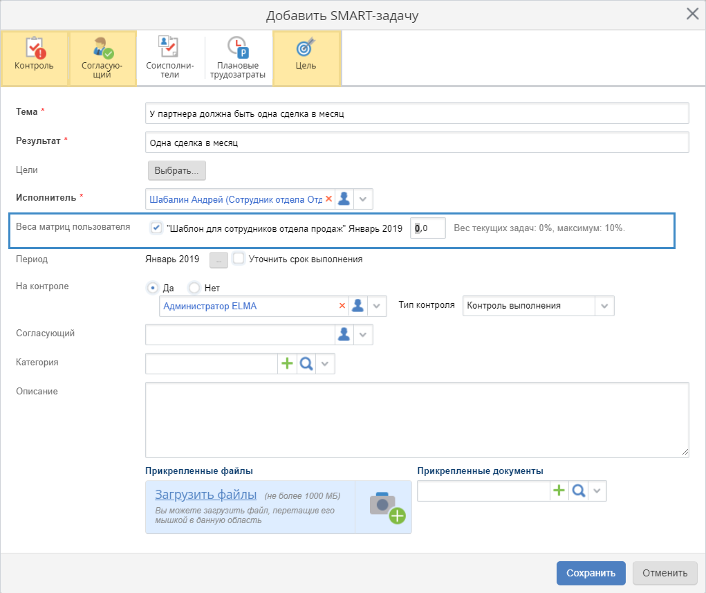 В примере SMART-задача У партнера должна быть 1 сделка в месяц веса вводятся вручную, будут ограничены сверху и нельзя превышать это ограничение:
