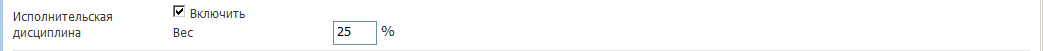 Еще одним из возможных методов оценки является исполнительская дисциплина. Появляется возможность посмотреть, сколько задач было поставлено, сколько выполнено в срок и сколько просрочено. Установите флажок Включить, если хотите, чтобы в матрице эффективности отображался раздел Исполнительская дисциплина, в котором показывается сколько задач в текущем месяце сотрудник выполнил в срок, а сколько просрочил. По этим данным считается процент исполнительской дисциплины. Укажите также вес этого раздела в матрице эффективности в процентах. В примере вес исполнительской дисциплины составляет 25%: