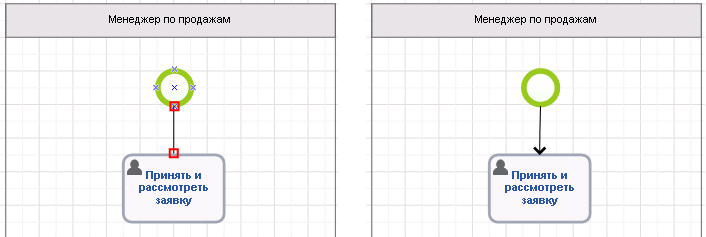 Переместите указатель мыши к краю второй операции, около указателя мыши появится небольшой красный квадрат, обозначающий точку входа в операцию. Отпустите левую кнопку мыши. Линия перехода будет создана. О направлении перехода позволяет судить стрелка на ее конце. На рисунке показано соединение начального события и первой пользовательской задачи процесса: