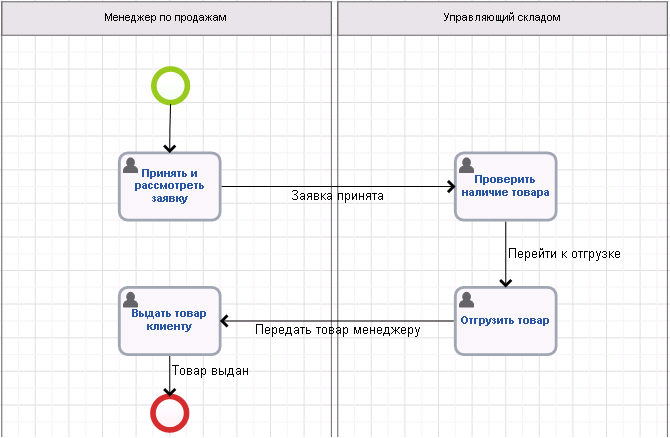 Таким образом соединим все элементы на графической модели между собой. Не забудьте добавить конечное событие (красный кружок) в зонах, где завершается процесс, и соединить его с предшествующей операцией.