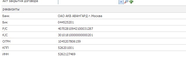 Bank = "ОАО АКБ АВАНГАРД г.Москва"; Bik = "044525201"; RS = "40702810942100031287"; KS = "30101810000000000201"; OGRN = "1045207806159"; KPP = "526201001"; INN = "5262127469";
