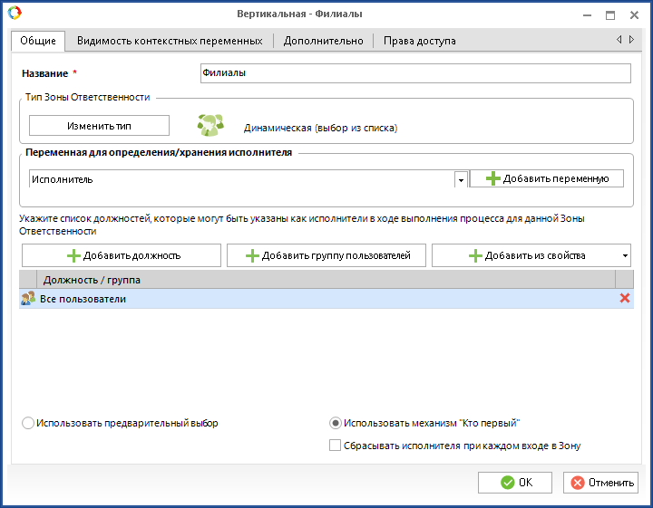 Иногда возникает необходимость назначить исполнителей зоны ответственности непосредственно в ходе выполнения бизнес-процесса. Если исполнитель должен быть только один, то для этого достаточно использовать динамическую зону ответственности, определяемую сценарием. Однако бывают случаи, когда требуется, чтобы задача зоны ответственности приходила группе пользователей по принципу «Кто первый» (кто первый взял себе задачу, тот и становится исполнителем зоны ответственности), и при этом группа пользователей определяется в ходе бизнес-процесса, то есть заранее неизвестна. Такую задачу можно решить, используя сценарий изменения настроек зоны ответственности.