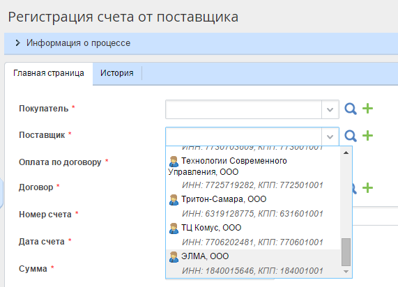 Так как текущий элемент имеет возможность быстрой фильтрации, поиск контрагентов можно вести не только по названию, вводя часть названия, но и по ИНН и КПП, что позволяет отобразить сокращенный список и выбрать нужную запись, исходя из подробной отображаемой информации.
