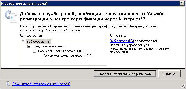 При нажатии на флажок Служба регистрации в центре сертификации через Интернет будет открыто диалоговое окно (рис. 6), в котором необходимо нажать на кнопку Добавить требуемые службы роли . После этого в окне Выбор служб ролей необходимо нажать на кнопку Далее .
