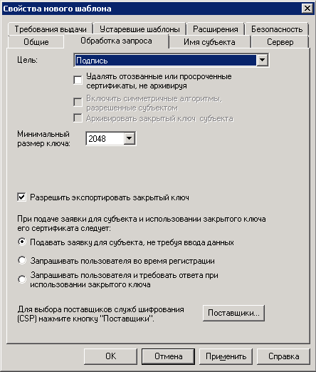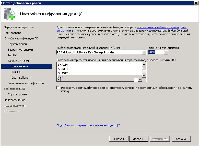 Рис. 10. Диалоговое окно "Настройка шифрования для ЦС"