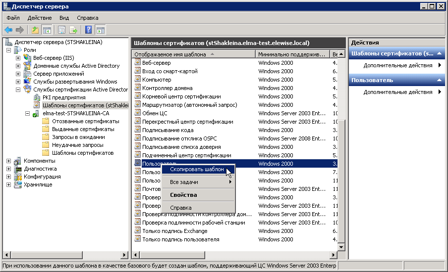 Рис. 23. Диспетчер сервера. Раздел "Шаблоны сертификатов". Пункт контекстного меню "Скопировать шаблон"