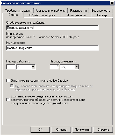 3. В открывшихся свойствах шаблона (рис. 25) необходимо на вкладке Общие указать имя шаблона и снять флажок Опубликовать сертификат в Active Directory .