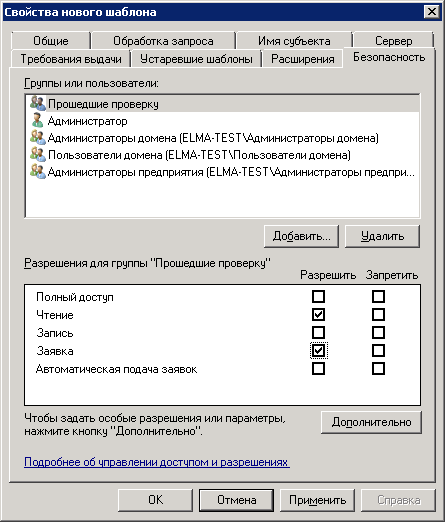 6. Необходимо перейти на вкладку Безопасность (рис. 28) и для группы Прошедшие проверку требуется установить флажок Заявка в колонке "Разрешить".