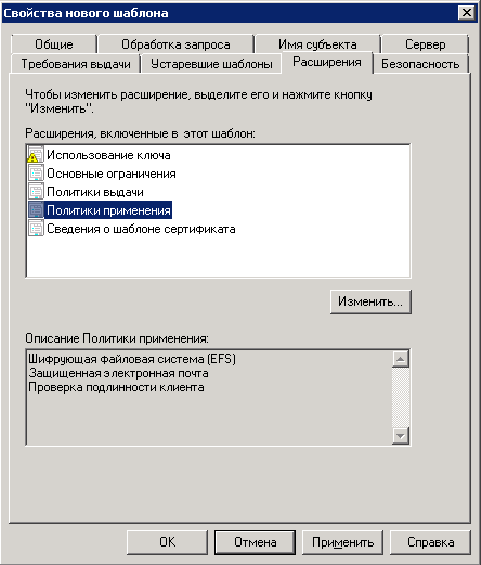7. Необходимо перейти на вкладку Расширения (рис. 29) и изменить настройки Политики применения . Для этого необходимо нажать на кнопку Изменить .