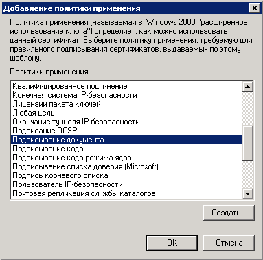 8. В открывшемся диалоговом окне (рис. 30) необходимо выбрать политику Подписывание документа и нажать на кнопку ОК . В том случае, если данный пункт отсутствует, необходимо нажать на кнопку Добавить .